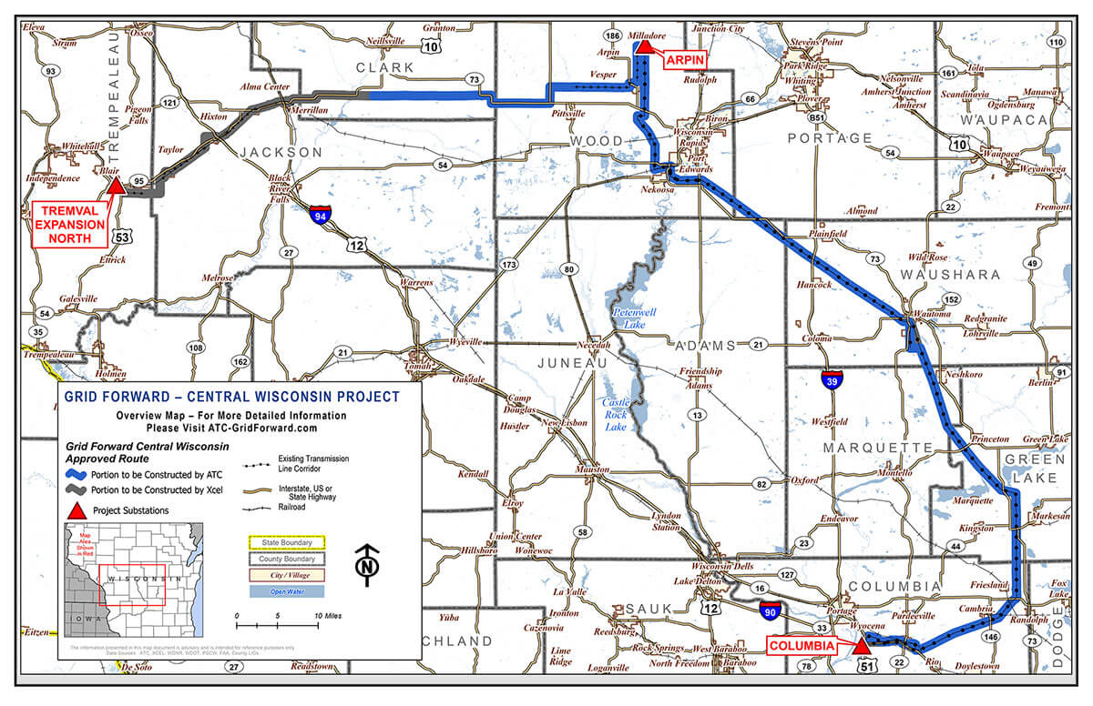 The Public Service Commission of Wisconsin (PSCW) verbally approved the Grid Forward Central Wisconsin project on October 30, 2025. In collaboration with Xcel Energy, the approved route will connect the Columbia Substation in Columbia County, the Arpin Substation in Wood County and the Tremval Substation in Trempealeau County.